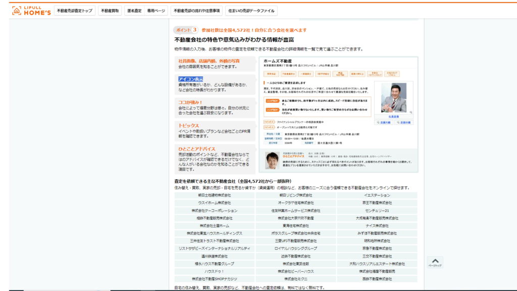 「LIFULL HOME’Sの不動産売却サービス」では業界トップクラスの不動産会社数ですが、数多くの不動産会社の中から会社を選ぶ際も不動産会社ごとの強みや特徴・意気込みを分かりやすく掲載しているので不動産会社選びもしやすいと評判です。
