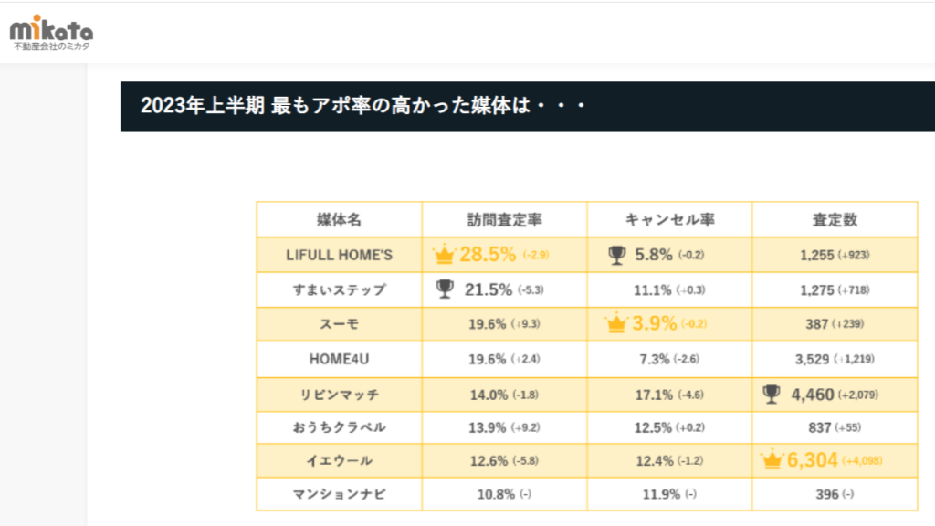 LIFULL HOME’Sの不動産売却サービスは、「不動産会社のミカタ」という不動産サイトにおいて「一括査定サイト訪問査定率ランキング」の訪問査定率において2022年・2023年で2年連続No.1を獲得しています。