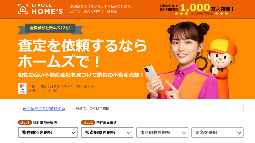 また、利用者数が多いみんなが使っているサイトということも大きなメリットとなります。LIFULL HOME’S(ライフルホームズ)の利用者数は1,000万人を突破しました(2023年9月現在)。この数字は不動産一括査定サイトの中でもトップクラスです。